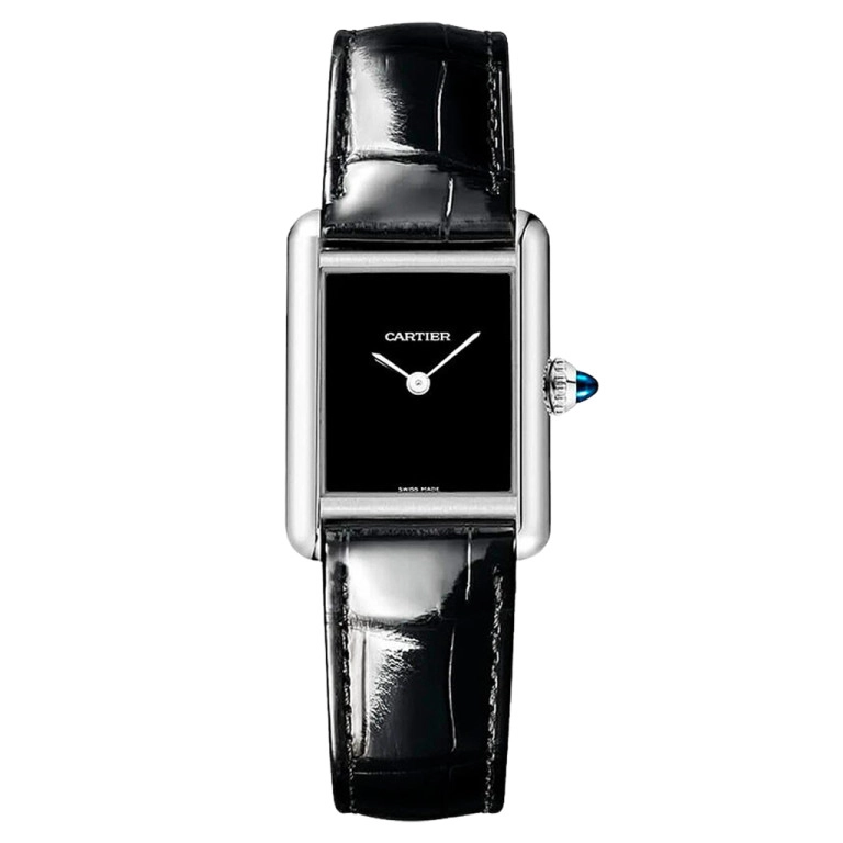 De stalen kast meet 29,5 × 22 mm en heeft de karakteristieke rechthoekige vorm die de Tank al meer dan een eeuw herkenbaar maakt. De diepzwarte gelakte wijzerplaat zonder cijfers benadrukt het minimalistische karakter, terwijl de rhodiumkleurige zwaardvormige wijzers voor een subtiel contrast zorgen. Het horloge wordt aangedreven door een betrouwbaar quartz uurwerk en is voorzien van een saffierglas en een zwarte lederen band.
