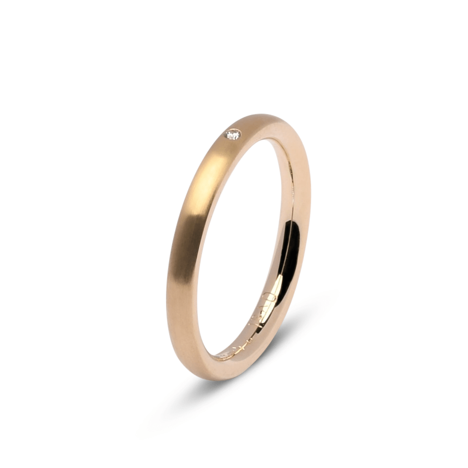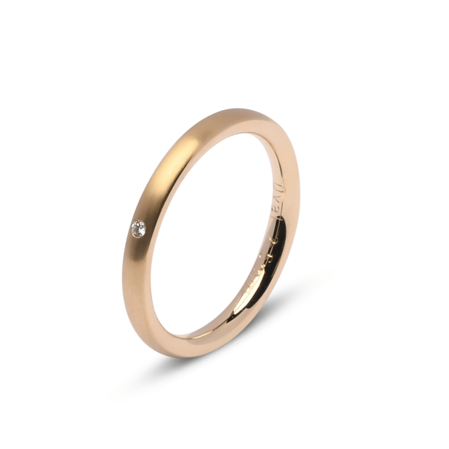 De damesring is 2,6 mm breed en is verfijnd met een briljant geslepen diamant van 0,01ct. De diamant heeft een hoogwaardige kwaliteit met kleur G en zuiverheid VS2, wat zorgt voor een subtiele maar schitterende uitstraling. De bijpassende herenring met een breedte van 3 mm, en heeft dezelfde elegante afwerking en vorm, wat de set tot een harmonieus geheel maakt.
