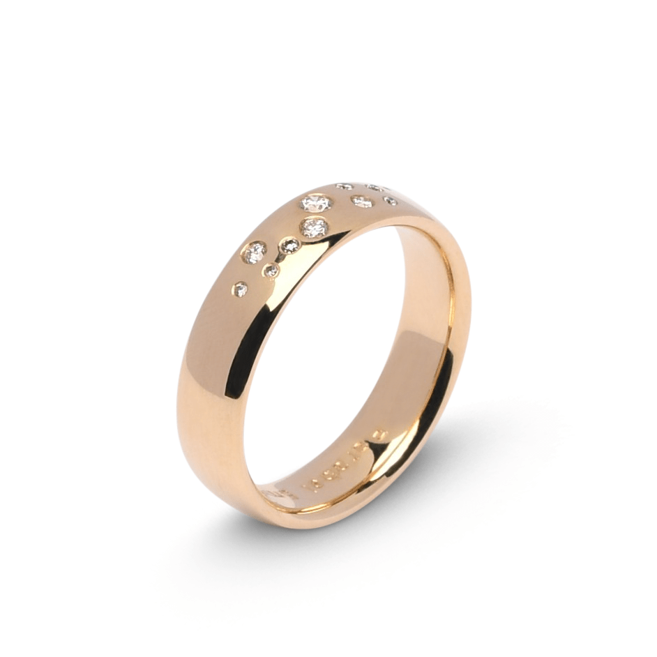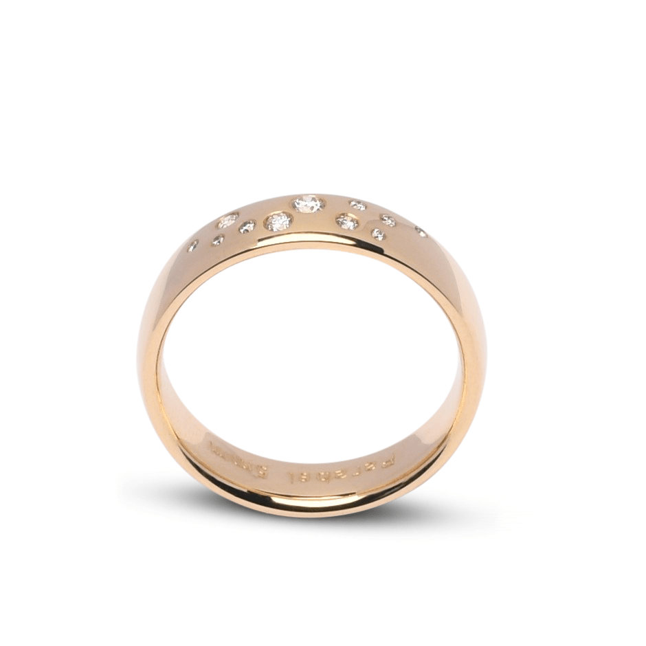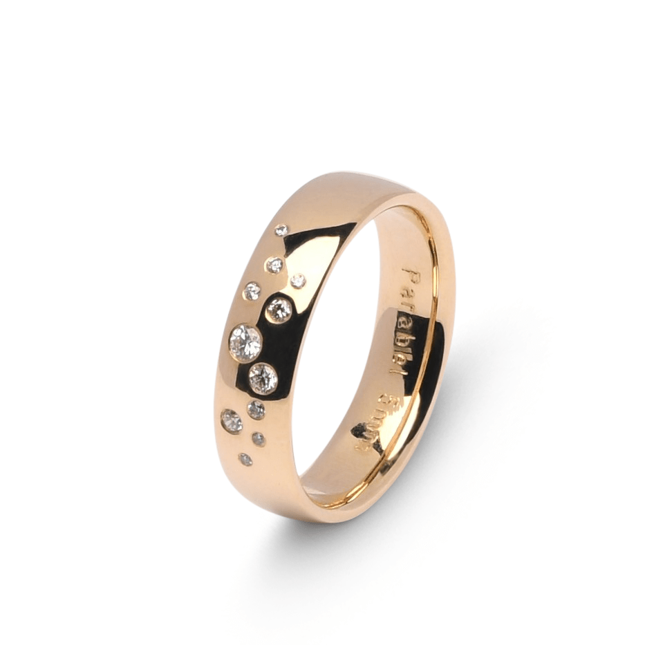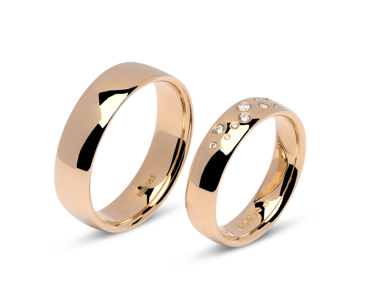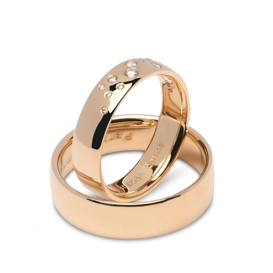 De herenring is 6 mm breed en straalt in hetzelfde luxe ontwerp, zonder diamant, waardoor beide ringen perfect op elkaar zijn afgestemd. Een bijzonder paar ringen dat vakmanschap en elegantie combineert voor een blijvende verbintenis.