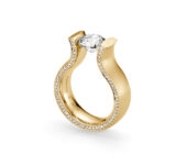De ring plaatst de solitaire steen op de voorgrond en de fijne briljanten benadrukken zijn fonkeling. Het is een romantisch, extravagant en uniek geheel.
