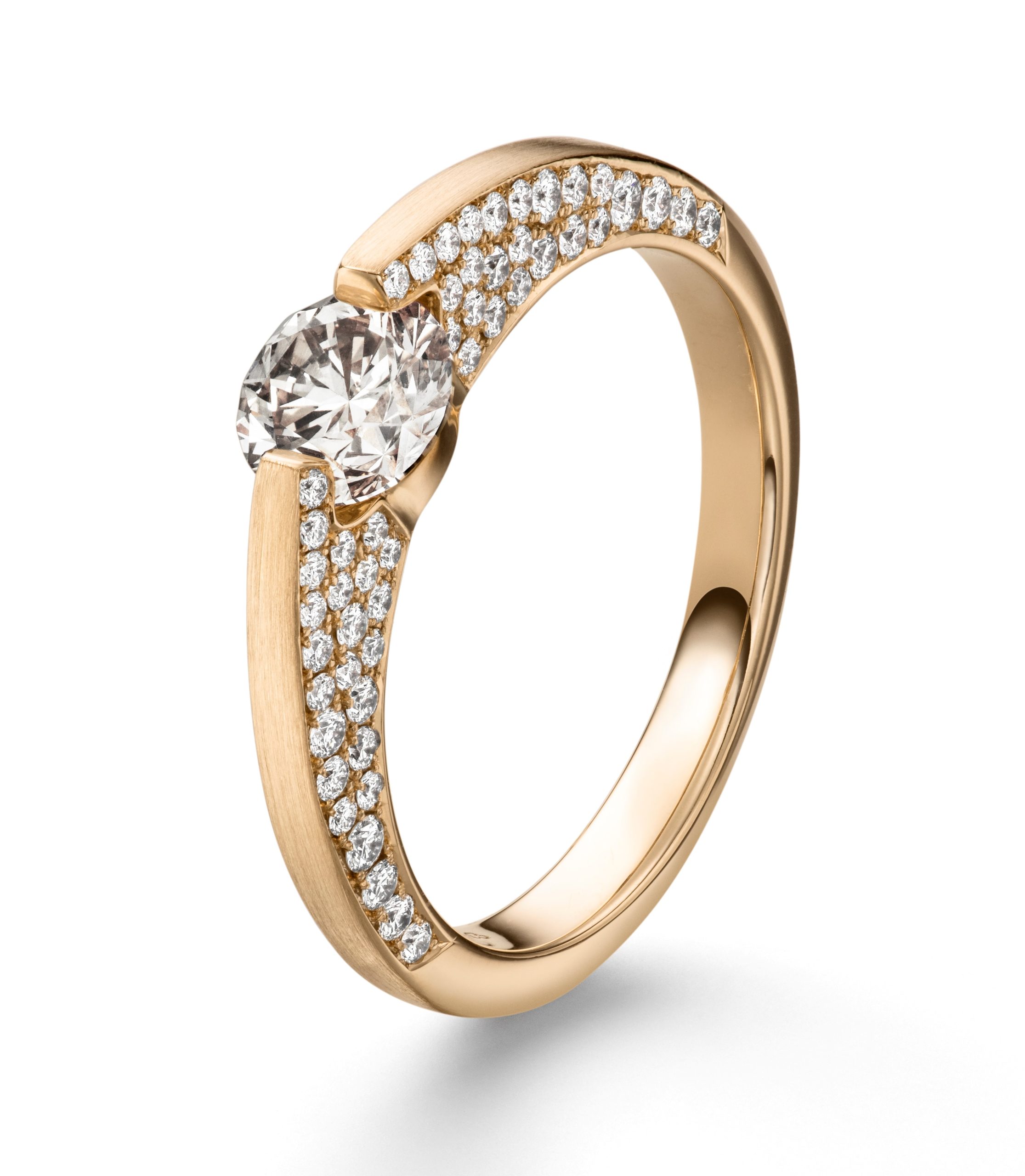 De Liberté ring is verkrijgbaar in de kleuren witgoud, geelgoud, roségoud en roségoud bruin. Centraal een 0,50ct briljant en daaromheen vele kleine briljanten totaal 0,575ct. Totaal diamantgewicht 1,075ct. Zuiverheid VS en kleur G.