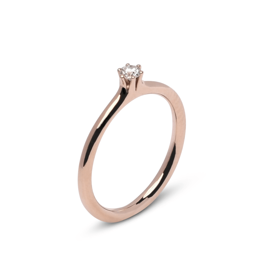 De damesring is 2,7 mm breed en straalt verfijning uit door de subtiele ingewreven zetting van één briljant geslepen diamant van 0,005 ct, kleur G en zuiverheid VS2. Afwerking hoogglans. Met daarbij een aanschuifring, een solitaire met een briljant geslepen diamant 0,11ct. eveneens van uitstekende kwaliteit (kleur G, zuiverheid VS2), wat zorgt voor een subtiel maar opvallend schitterend detail. Afwerking satijn-mat.