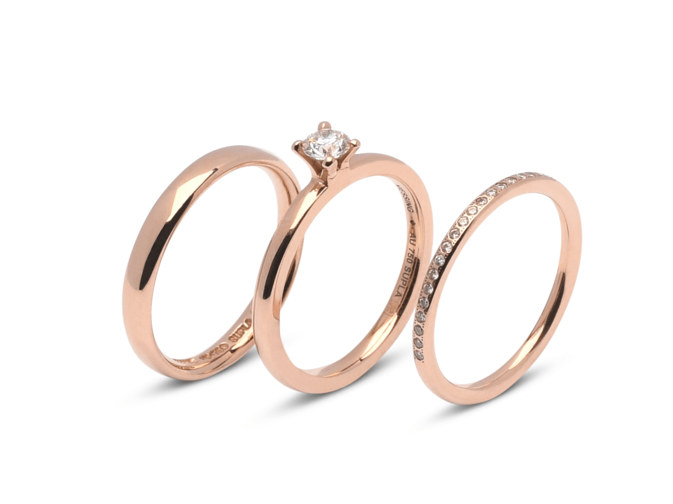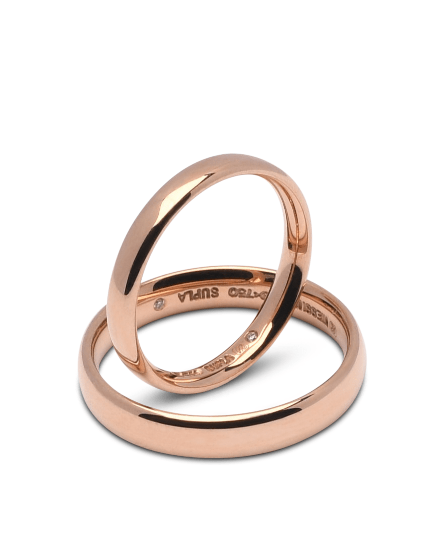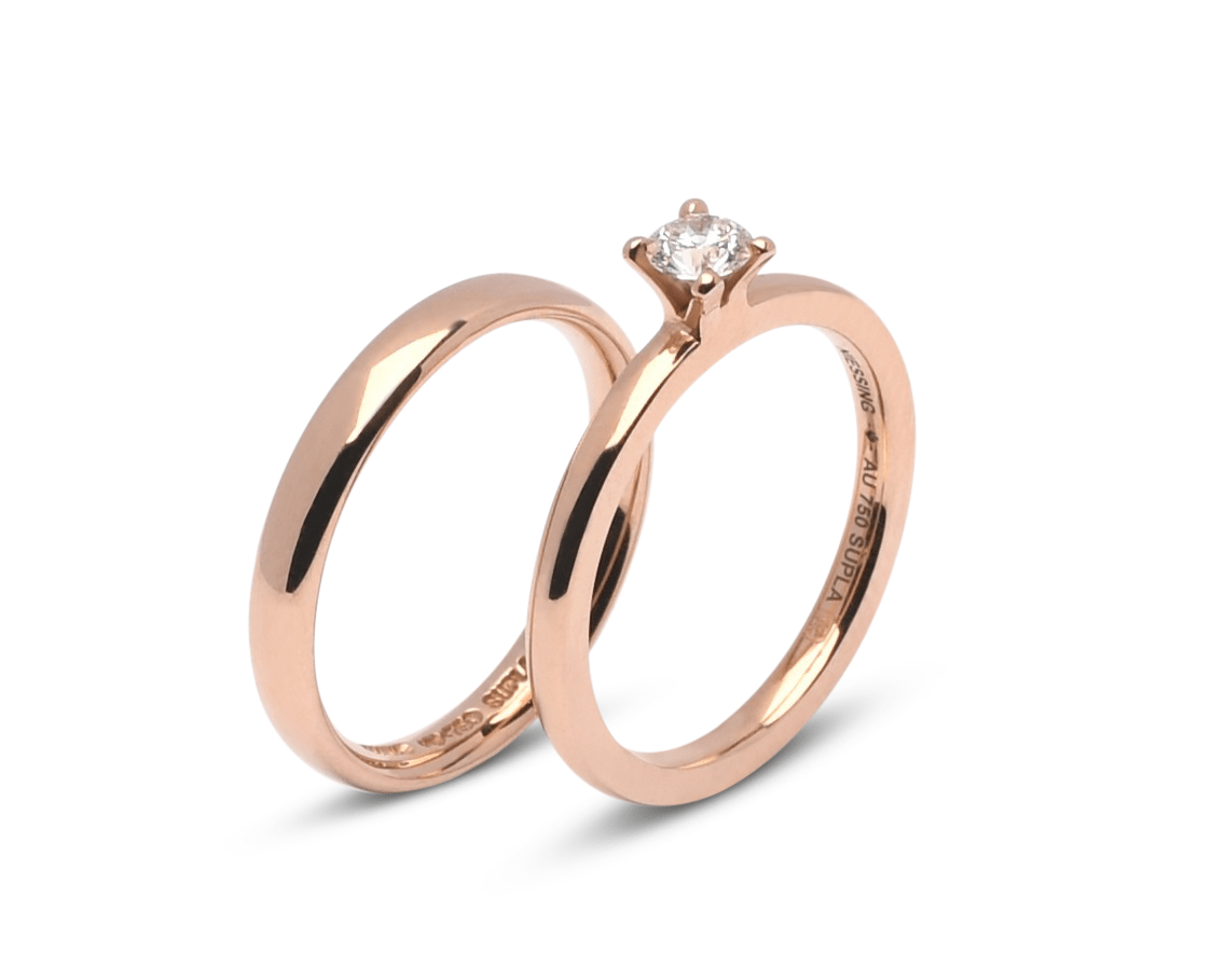 Deze prachtige trouwringen zijn vervaardigd uit exclusief 18 karaats Supla Grenadine goud, met een luxe hoogglans afwerking die elke ring laat stralen. De damesring heeft een breedte van 3 mm, terwijl de herenring iets breder is met 4 mm, perfect afgestemd op elkaar.