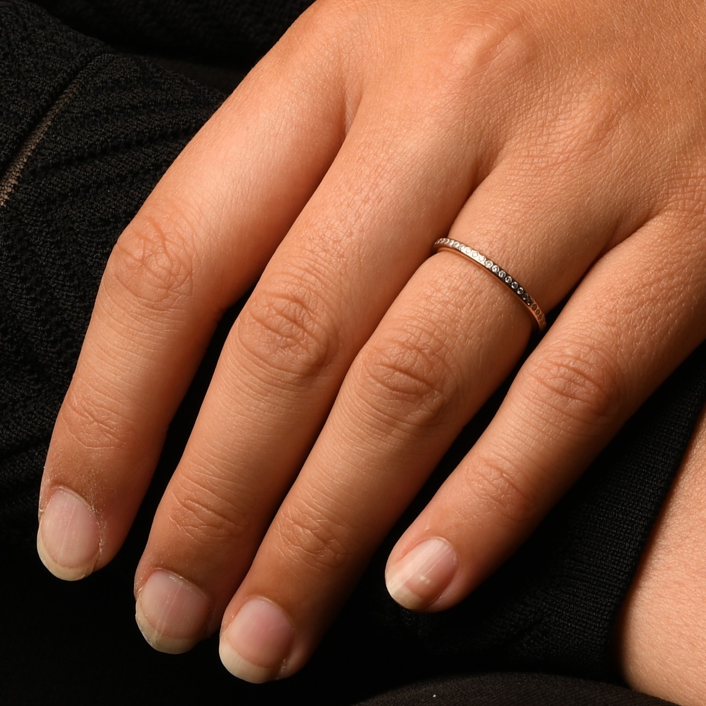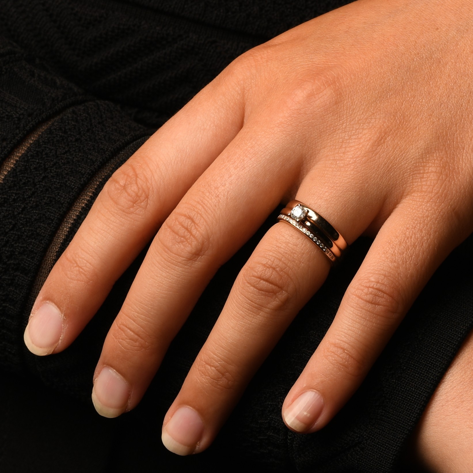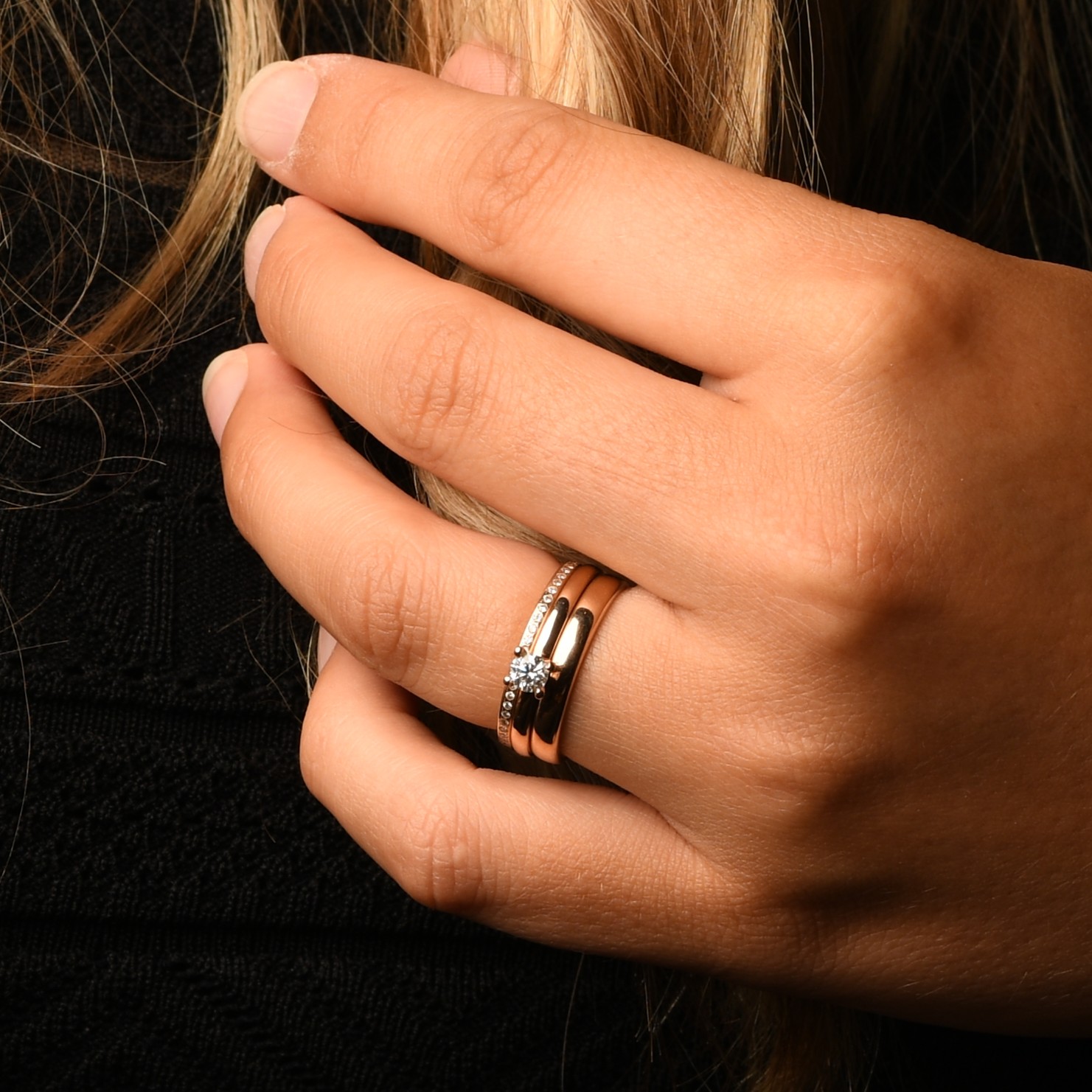 Maak de set compleet met een bijpassende aanschuifring: een verfijnde memoire ring bezet met 26 briljant geslepen diamanten van elk 0,005 ct, met een totaalgewicht van 0,13 ct. De diamanten hebben een zuiverheid van VS2 en kleur G, voor een subtiele, sprankelende toevoeging die perfect harmonieert met de trouwringen.